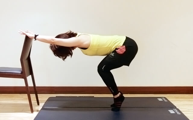 ⑤息を吸いながら前屈が崩れないように、踵を降ろします。降ろす際に床に踵が全て着地する一歩手前で止めて下さい。